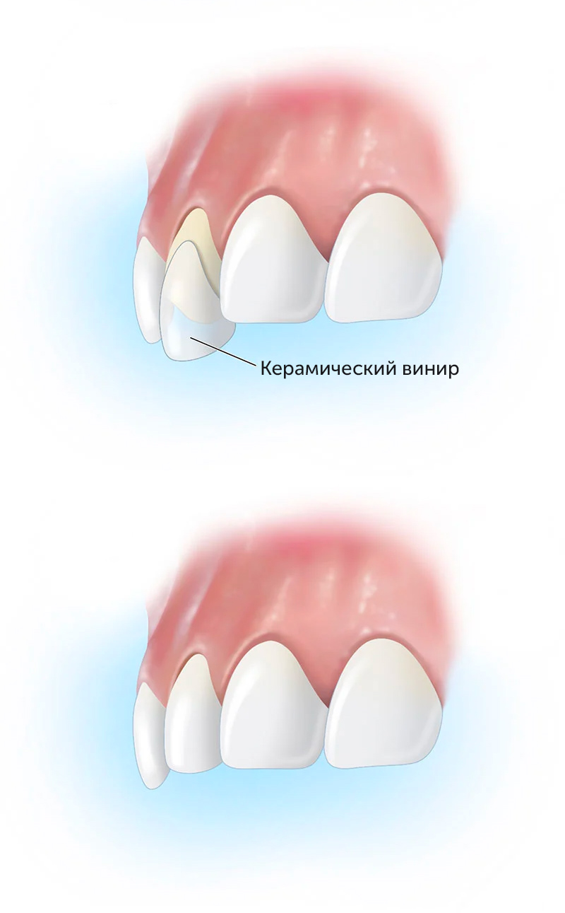 Керамические виниры — тонкие, но очень прочные пластинки из керамики (фарфора), которые устанавливаются на переднюю, то есть видимую поверхность зубов. Позволяют скорректировать цвет и форму зуба.